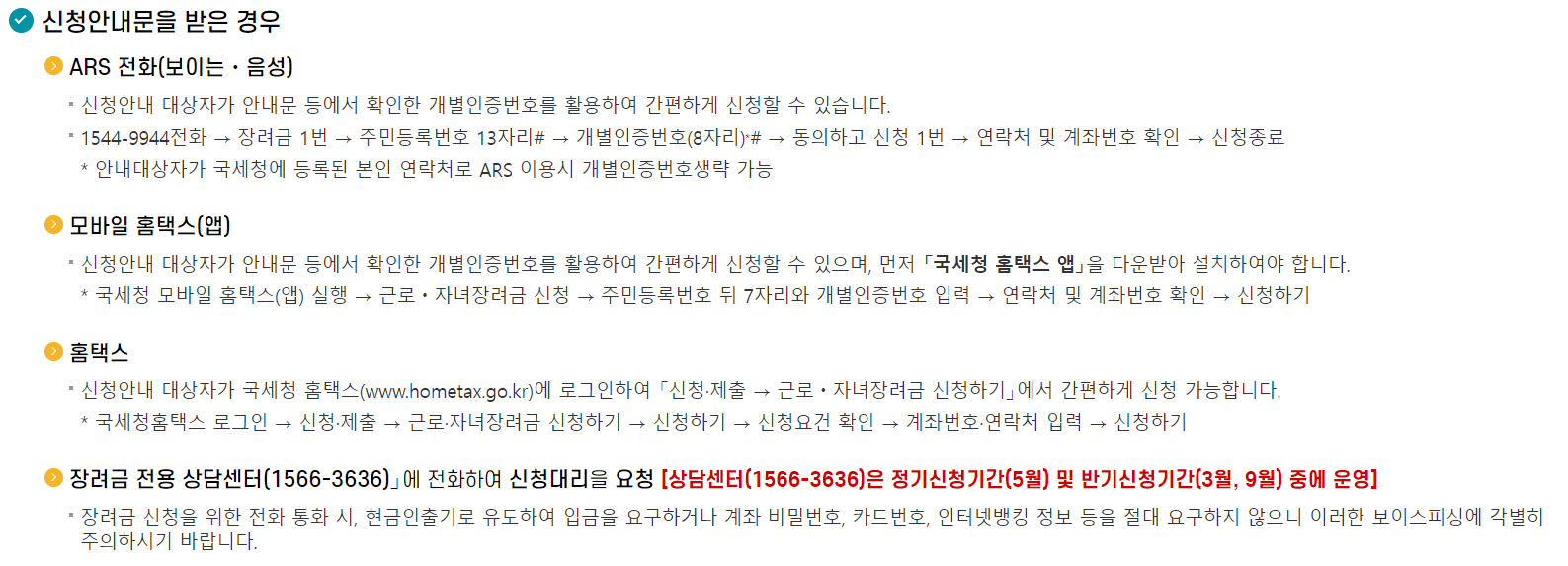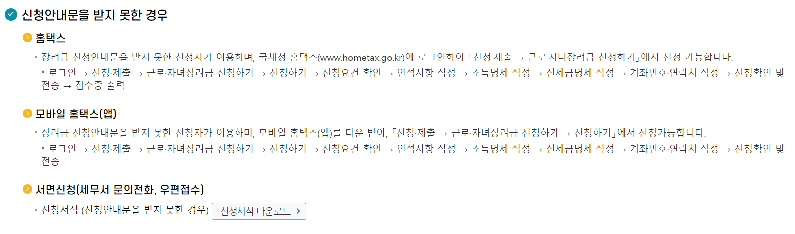 근로장려금을 신청하기 위해서는 2가지 방식이 존재합니다. 개인은 매년 연말정산을 하게 됩니다. 이러한 연말정산 내역들이 매년 데이터가 쌓여서 본인의 기록이 남게 됩니다. 이러한 기록들이 쌓이면 해당 요건에 해당되는 분들은 서면으로 우편을 송달 받게 되는데, 이러한 방식으로 안내 사항이 오신 분들은 다음의 절차를 진행하시면 됩니다.